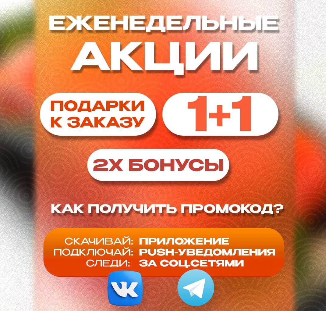 Каждую неделю — новая акция. Подписывайся на соц. сети или включи пуш-уведомления в приложении, чтобы не пропустить!